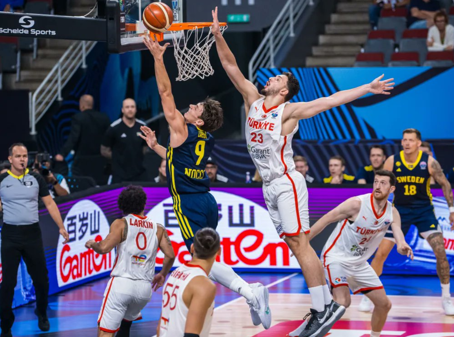 瑞典的策略就是封堵申京的个人进攻,包夹迫使申京提前传球,结果土耳其此役的外线的确不准,申京上半场10中3手感也不佳,只拿到7分8篮板1助攻。
