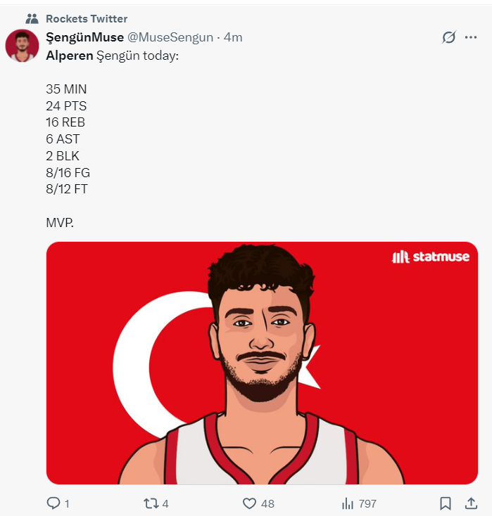 最后1分钟申京封盖后快下双手暴扣全场各种欢呼,随后申京制造安德森第五次犯规,只可惜两罚不中有些尴尬,随后申京两罚一中后被换下,全场比赛申京35分钟,16中8,罚球12中8,拿到24分16篮板6助攻2盖帽,命中率50%。